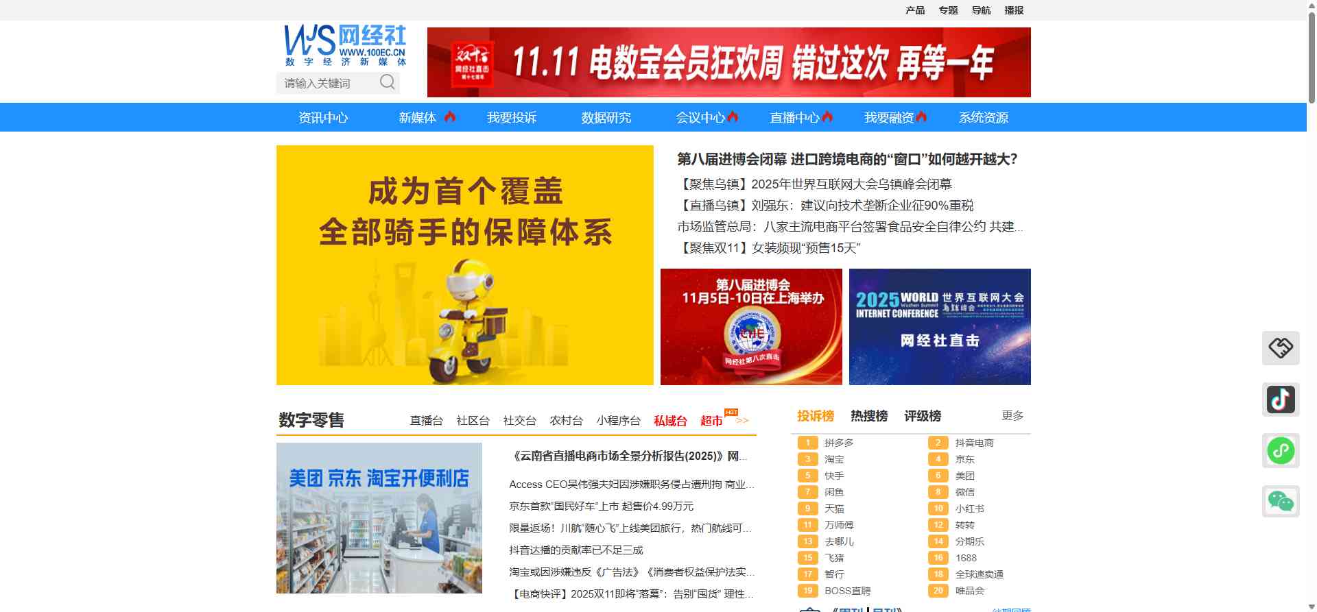 网页关键词:网经社 网络经济服务平台 电子商务研究中心 数字经济门户 **电商门户 数字零售 数字生活 数字产业 数字教育 数字监管 数字研究 移动电商 跨境电商 新零售 农村电商 农产品电商 社交电商 大宗电商 海淘 美妆电商 生活服务电商 B2B B2C 020 OTA 在线差旅 在线外卖 共享经济 网络零售 淘宝网店 淘品牌 网红直播 物流快递