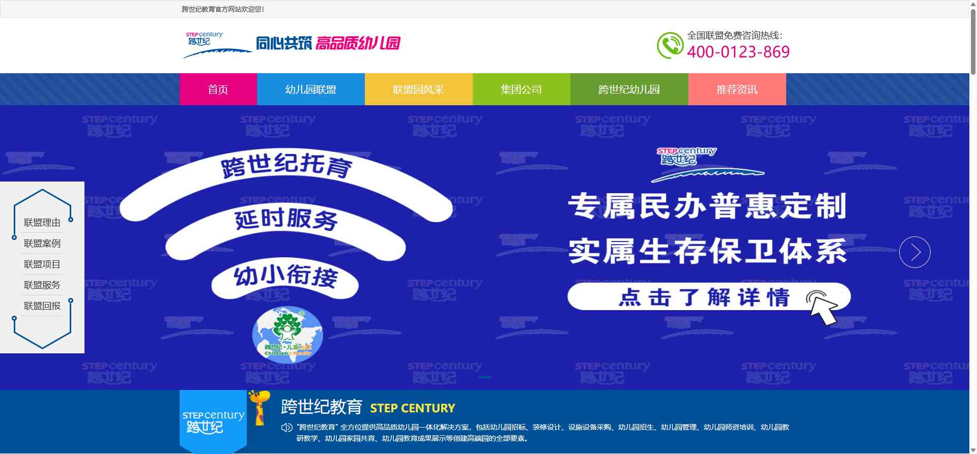 网页描述:跨世纪教育是高品质幼儿园联盟,国内幼儿园联盟品牌,致力于蒙特梭利(蒙氏教育)教育联盟、亲子教育联盟、感觉统合训练联盟,全国20多个省份1000多家联盟园均成为当地收费高、口碑好、发展快的示范园,领跑当地幼教。联盟跨世纪,联盟成功,联盟财富。全国免费联盟热线:400-0123-869