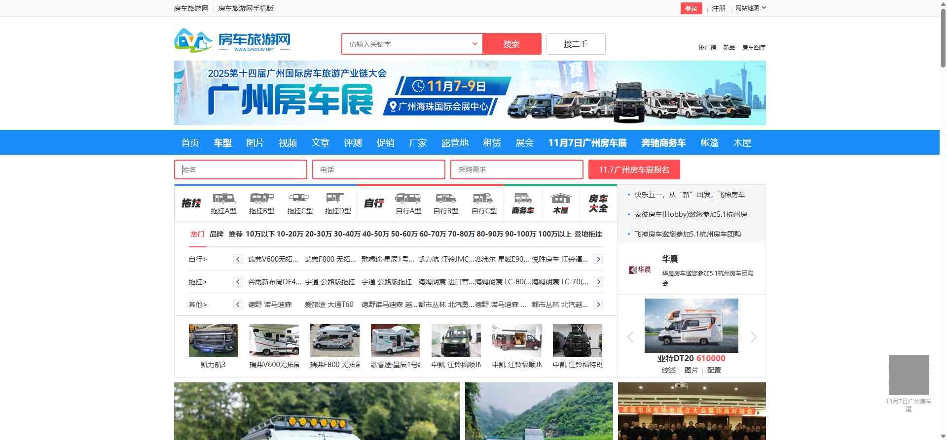 网页描述:房车旅游网汇集了房车资讯,房车展会,房车租赁,二手房车等内容,已与百余主流房车厂家达成战略合作。看房车,买房车就上房车旅游网!