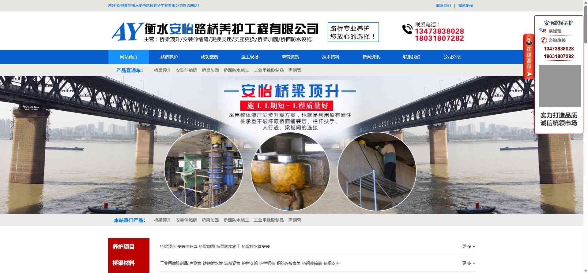 网页描述:衡水安怡路桥养护工程有限公司主营,公路养护服务:桥梁加固、桥梁顶升、桥面防水施工、更换支座、更换支座、安装伸缩缝、公路设施维护等;销售桥梁支座、伸缩缝、止水带、防水涂料、金属制品、土工制品、铸铁泄水管、护栏支架、波纹管涵、声测管,修补裂缝,橡胶减速带,钢钎维,桥梁支座,橡胶支座,伸缩缝,止水带等公路桥梁用材料。