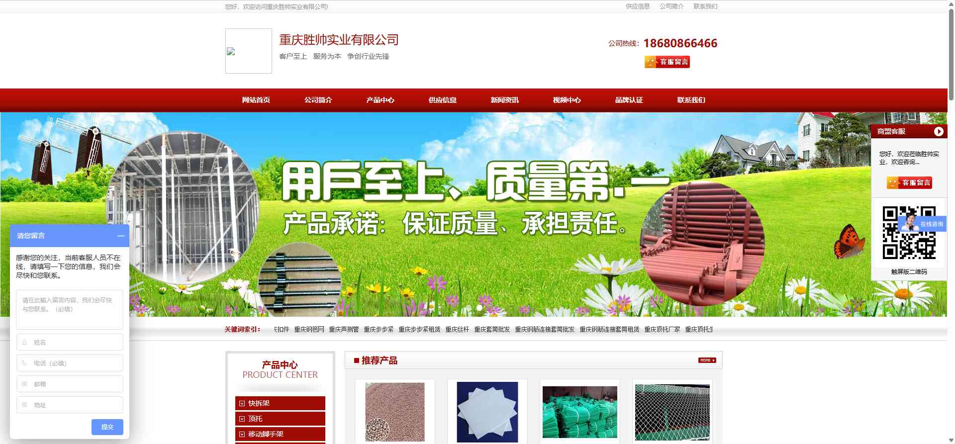 网页描述:重庆胜帅建材是一家以快拆架、顶托、移动脚手架、扣件、高强丝杆、步步紧、钢筋连接套筒灯建材生产批发租赁为一体企业